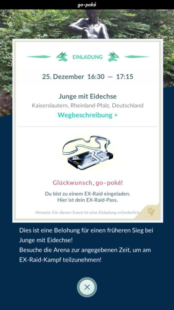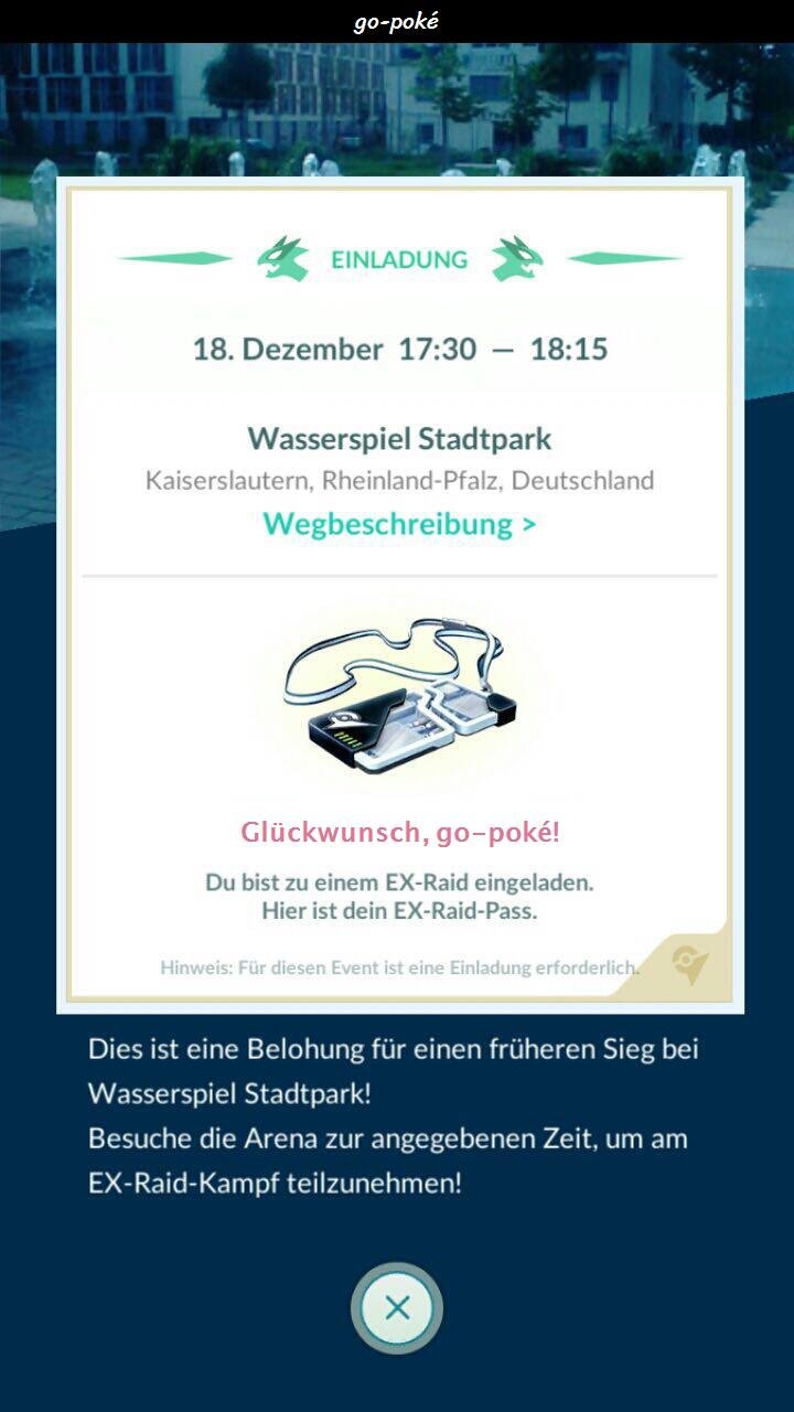 * Beim ersten Ex-Raid-Probelauf betrug die Dauer noch 60 Minuten, da damals Raids allgemein noch eine Stunde gingen. Erst im späteren Verlauf wurde die Zeit für Raids und somit auch für Ex-Raids auf 45 Minuten gesenkt.